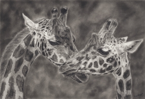 Two giraffes lean close, their long necks gently touching in a quiet exchange of affection. There’s grace in their stillness and tenderness in their connection – a moment that speaks of love without words. I was drawn to their elegance and calm, the way they find closeness even in their towering forms.