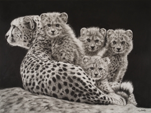 A mother cheetah rests, ever alert, while her cubs huddle close beside her. Their small faces peek out with curiosity, safe under her gentle gaze. In her stillness lies strength – the quiet power of a mother protecting what she loves most. This artwork is a reflection of trust, care, and the bond that defines family in the wild. Under Her Watch captures a fleeting moment of tenderness and courage – where love becomes the truest form of protection.