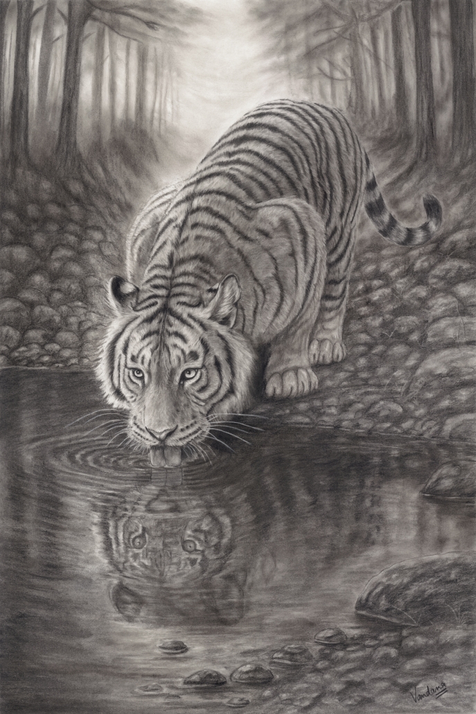 Where Power Pauses captures a rare and intimate moment of stillness in the life of a tiger. Known for its strength, intensity, and commanding presence, the tiger is shown here in a quieter state – pausing to drink, grounded in calm rather than motion. This artwork reflects both power and vulnerability, reminding us that even the wildest creatures have moments of peace.